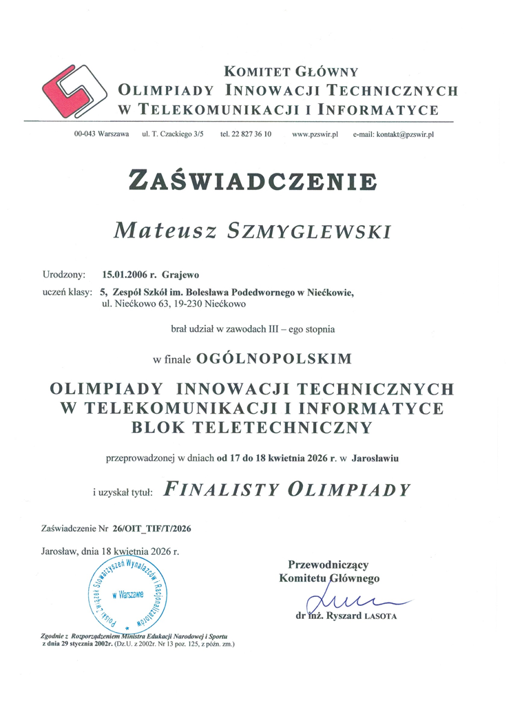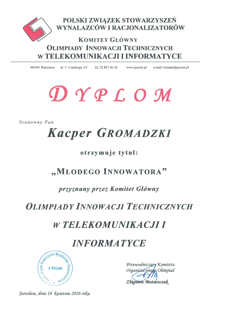 Mateusz Szmyglewski, uczeń klasy V oraz Adam Koniecko, uczeń klasy III kształcący się w zawodzie technik informatyk, zdobyli tytuł finalisty Olimpiady Innowacji Technicznych w Telekomunikacji i Informatyce – konkursu o charakterze naukowo-technicznym, organizowanego przez Polski Związek Stowarzyszeń Wynalazców i Racjonalizatorów (PZSWiR). W finale uczestniczył również Kacper Gromadzki, uczeń klasy III technikum w zawodzie technik informatyk.